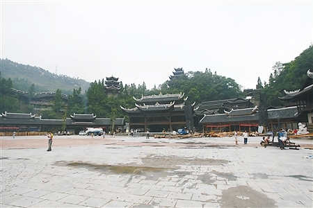 18日下午,天空飘着细雨,采访车在彭水西下道不久,一座规模庞大、气势恢宏的苗家古建筑群映入记者眼帘。据介绍,这是彭水县打造中的我市首个苗家风情4A级景区——蚩尤九黎城。